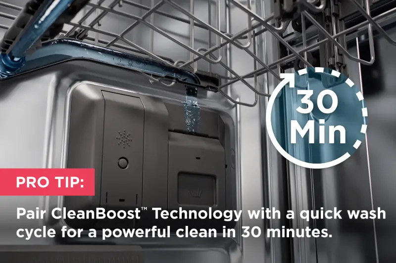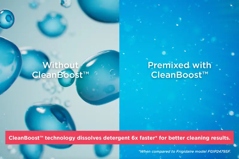 Our patented CleanBoost™ Technology premixes water and detergent, dissolving detergent 6x faster helping to remove hard-to-clean and baked-on foods.
