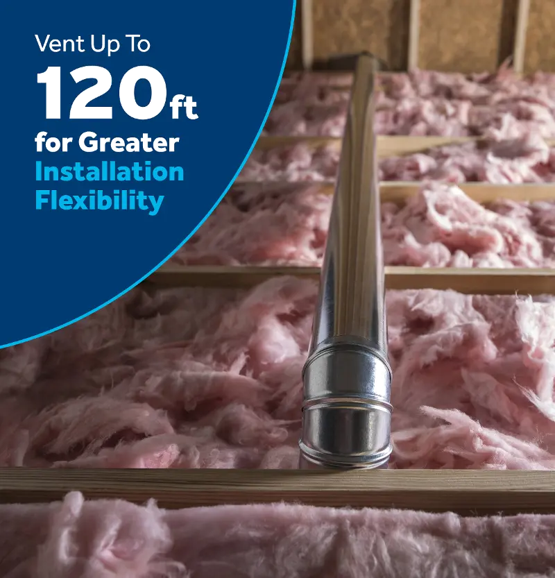 Powerful airflow offers long-lasting performance from lint build-up and offers venting solutions up to 120 feet for greater installation flexibility​.