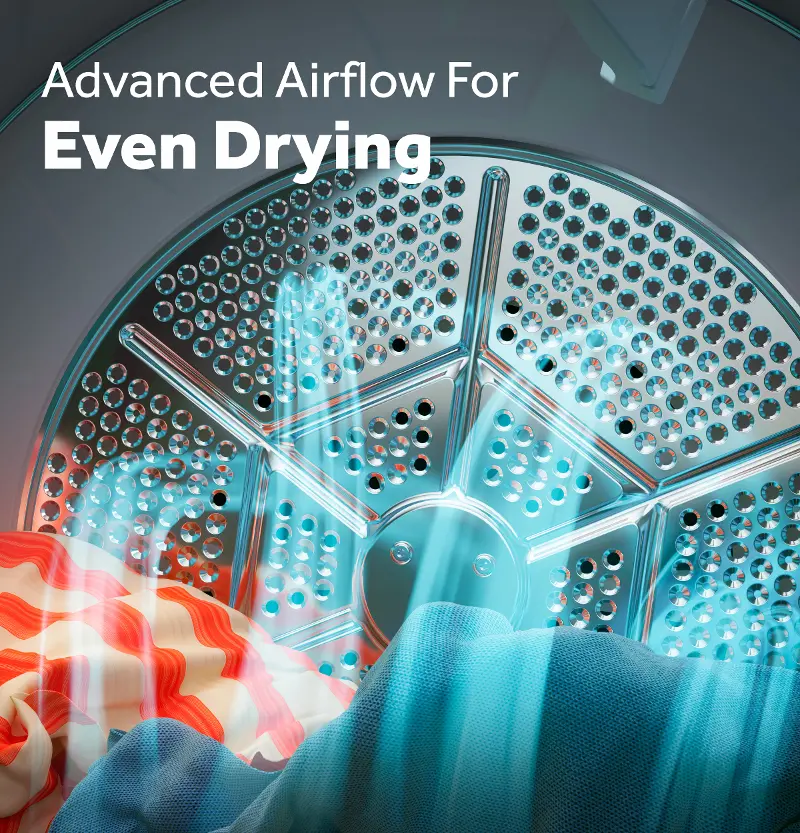 A large internal heat diffuser allows for warm air to evenly spread throughout your clothes during the cycle, making this the ideal dryer for large loads and bulky items.