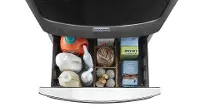 - The storage drawer can hold essential items and full-size bottles of laundry detergent, fabric softener