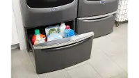 Raise your washer and dryer to a more comfortable height for loading and unloading. A large storage drawer is included to hold and hide your laundry supplies, including large detergent bottles and boxes.