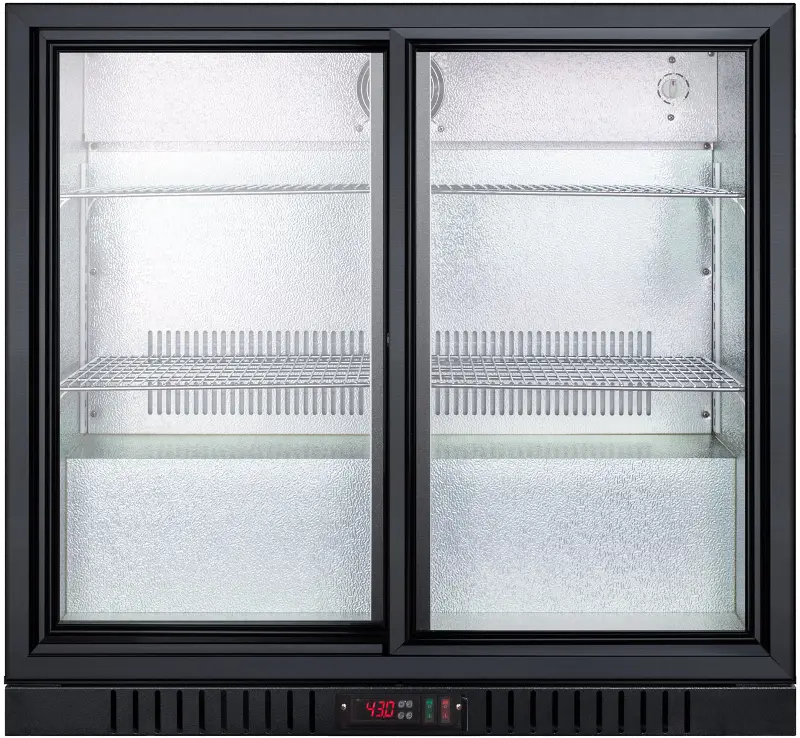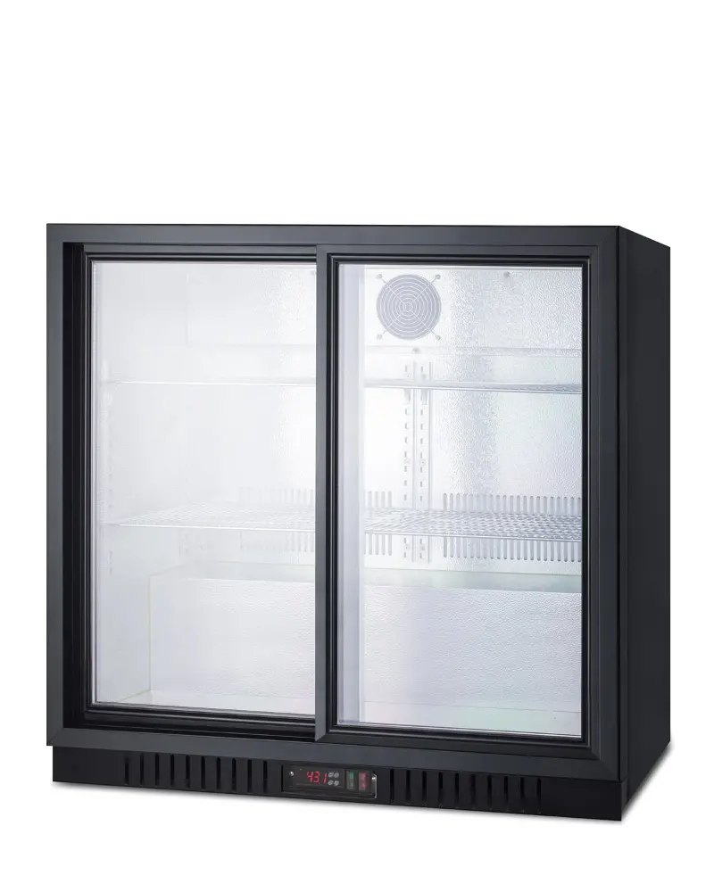 Two sliding glass doors offer a full view inside the 7.4 cu.ft. hammered aluminum interior, with interior lighting for added product visibility and fan-forced cooling to help improve temperature distribution. Adjustable chrome shelves allow you to rearrange storage to accommodate a variety of sizes. This unit includes a factory-installed lock for added security and a digital thermostat for easy temperature management.