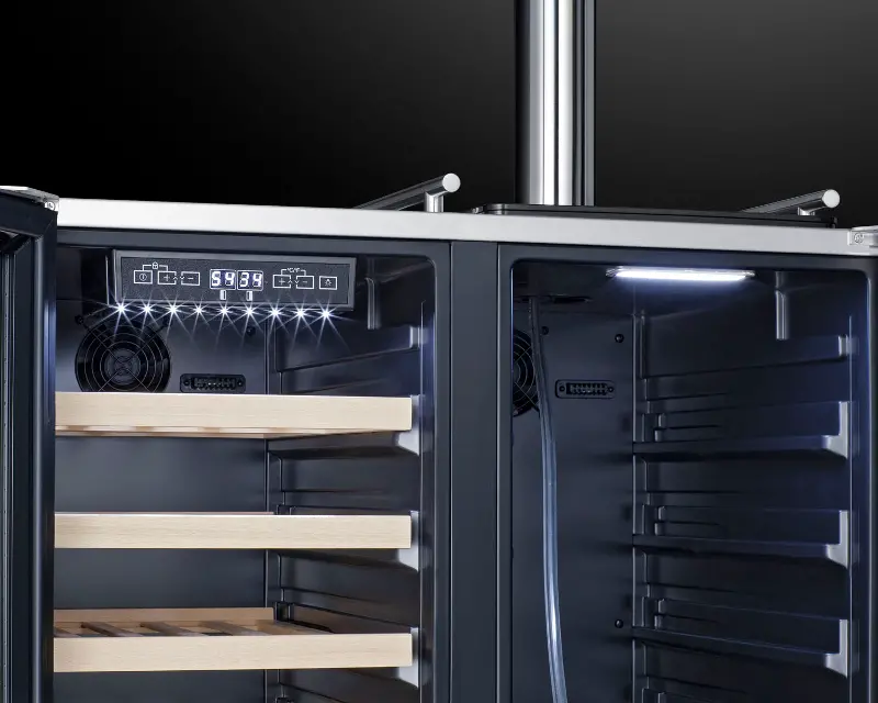 Equipped with a French door combination wine cellar/kegerator, with two separate sections that let you keep wine properly stored and displayed while also serving beer on tap. The front-breathing design enables built-in installation under counters, while the fully finished stainless steel cabinet also allows freestanding use. We include a set of casters (two locking) for installation if using this cooler for more portable applications. The sealed rear and weatherproof exterior ensure safe use in outdoor kitchens. The left-side wine cellar zone features a stainless steel-trimmed double-tempered glass door to display your bottles in style. White LED lighting offers an attractive and efficient presentation. Adjustable wooden wine shelves let you store your bottles safely. On the right side, a fully featured kegerator is designed to let you serve beer from 1/6 (sixtel) sized kegs. We include all the tapping equipment you need, with a stainless steel draft tower and faucet, CO2 tank, and regulator. A removable guard rail and two-piece drip tray help you keep your serving area clean. Both units utilize intuitive digital controls with wide temperature ranges, letting you accommodate a variety of wine and beer styles for proper storage. Each door includes a pro-style handle and factory-installed lock for added security as needed. Can be used in indoor or outdoor kitchens. With its professional design and versatile functionality, it's the ideal choice for home bars looking to please all beverage tastes.
