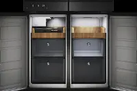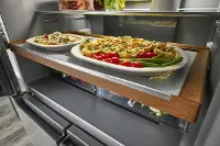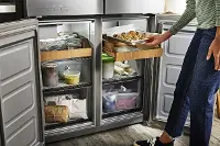 Located throughout the refrigerator and freezer areas, the sliding storage trays are a versatile area for storing platters, organizing ingredients and keeping items easily accessible. It comes in a wood-look finish that is stain-resistant, and tray removes fully for easy cleaning.