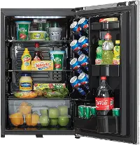 Drawing inspiration from mid-century styling and simplicity, the Contemporary Classic collection of compact refrigerators reimagine retro for the modern consumer. Featuring an exclusive retro-inspired curved door design, metallic door finish, door lock, rubber-grip ergonomic chrome handle and stylized chrome worktop, its exterior features are only outmatched by its signature black interior. Boasting 4.4 cu. ft. of storage and cooling space, it features two and a half tempered glass shelves for maximum storage versatility and a vegetable crisper with a glass top. The spacious unit helps keep electricity bills in check with its Energy Star rating and state-of-the-art mechanical thermostat. It also includes an efficient CanStor beverage dispenser and reliable interior white LED light. This model is built for convenience as the reversible door hinge allows you to adjust it for either left or right-handed opening.