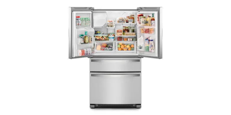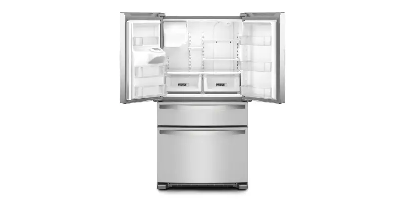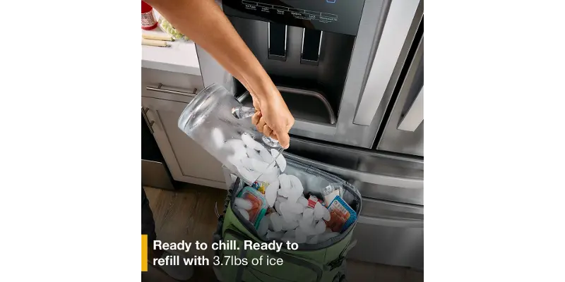 No French Door Bottom Mount Refrigerator in-door ice maker holds more ice. With 3.7lb, your ice maker keeps up with your family.
