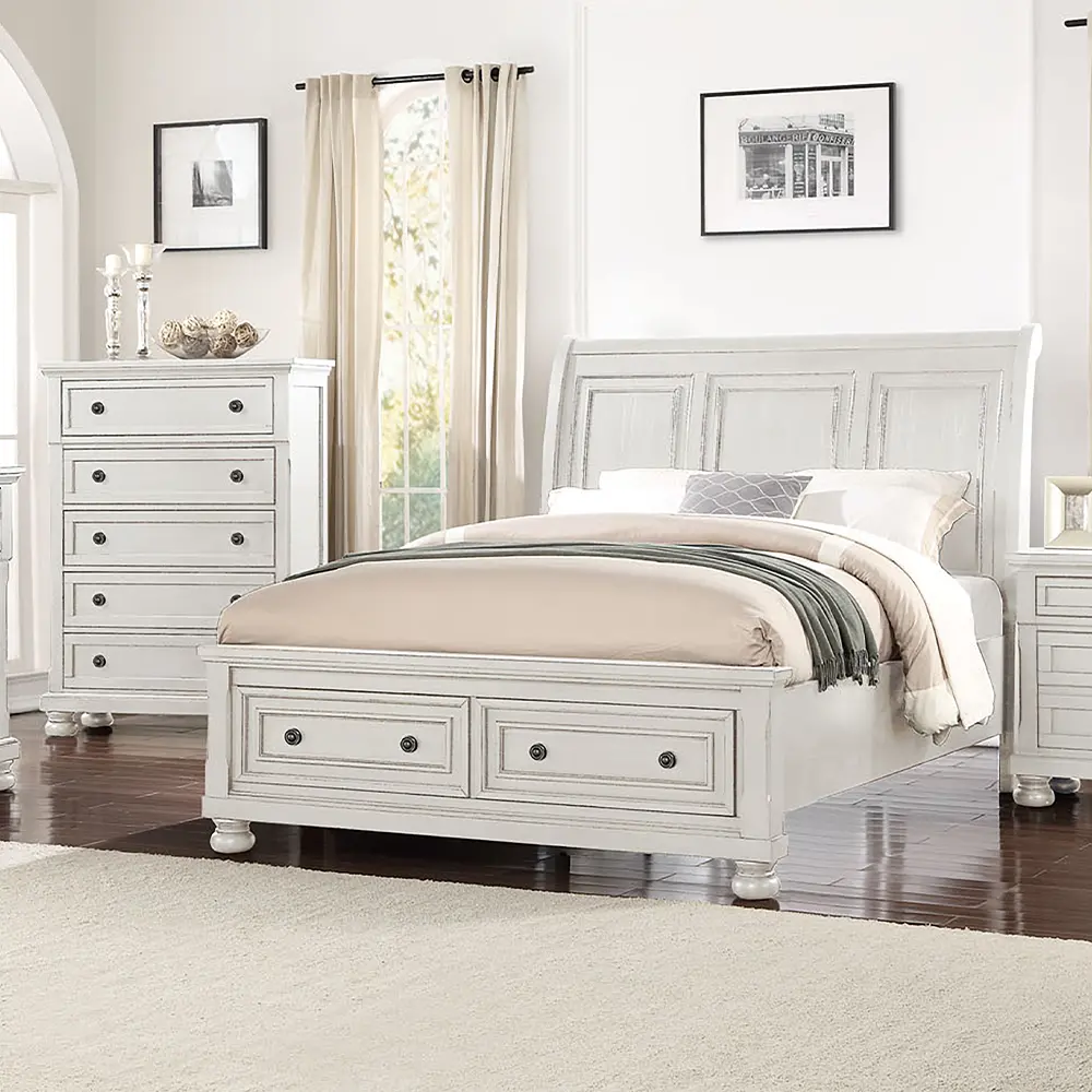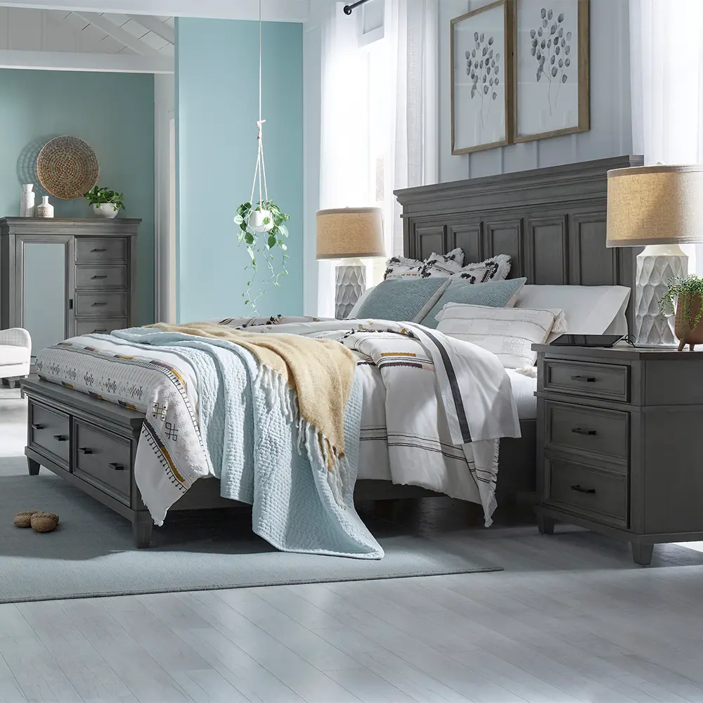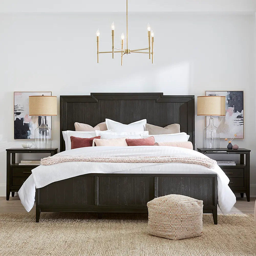 This collection combines a simple design with modern functionality. It features aged bronze hardware, adjustable shelving, USB ports in headboards, and sleek finishes with practical storage solutions.