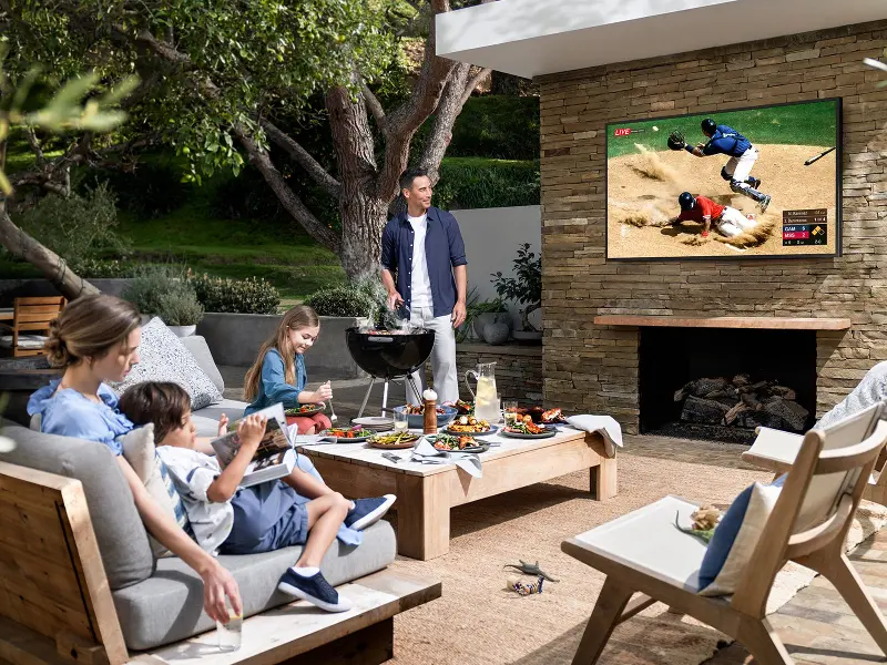 Bring 4K QLED entertainment to your patio with the Samsung Terrace 75 inch Outdoor Smart TV.
