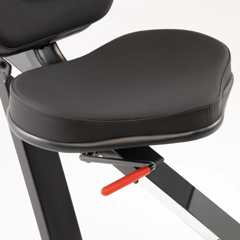 The recumbent exercise bike seat is adjustable to best fit the user's needs. The chrome finished sliding track allows you to adjust the seat for a smoother workout session.
