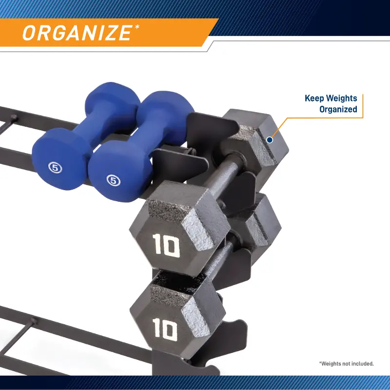 Store your weights on a stand where you can access them quickly while keeping things organized in your home gym. The DBR-56 dumbbell rack features multiple trays that accommodate different sizes of dumbbells.