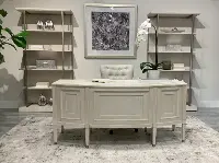 With a luxurious champagne finish and exquisite metallic accents, its refined glam design adds elegance to any office setting. This desk provides ample storage with its five available drawers, helping you keep your essentials organized. Crafted with precision, three top drawers feature felt-lined bottoms for delicate items, while the others boast veneer finishes for a sleek look. Elevate your work environment with this Executive Desk, where style meets functionality!