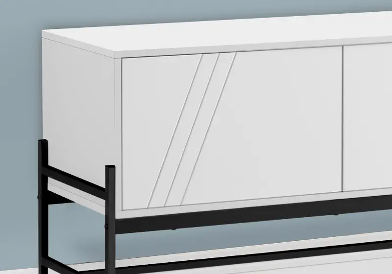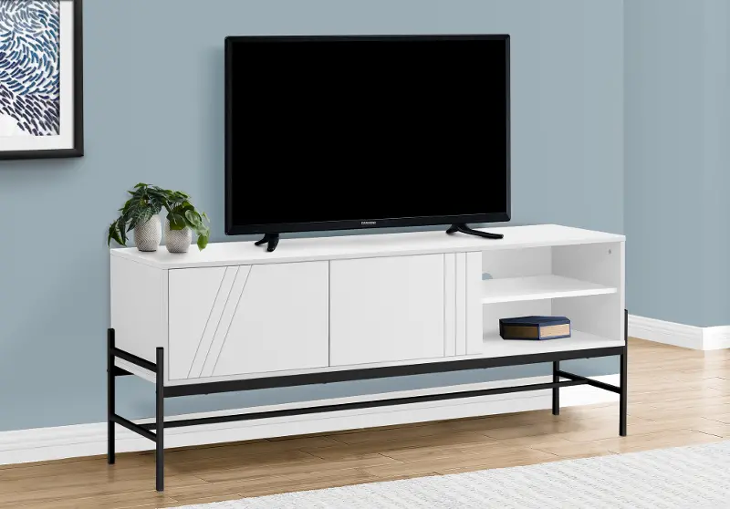 This contemporary stand is constructed in white laminate on top and supported with a sleek black metal frame. It offers plenty of storage for your media with a closed cabinet accented with sleek groove lines design on the doors and an open shelf space for your media equipment. This TV console unit includes a hidden wire management hole behind the fixed open shelving and another behind the spacious storage cabinet to keep your cables organized and out of sight. Durably designed and backed with a 5-year limited warranty, you will be getting a product made with quality in mind.
