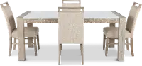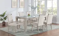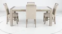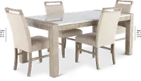 Sturdily crafted, this 5-piece dining set boasts a dining table with a brushed light gray wood frame and a striking white marble top. The side chairs feature beautifully upholstered seats and backrests, adding comfort and texture. The dining set's simple silhouette and inviting contemporary charm will be a welcomed addition to your home.