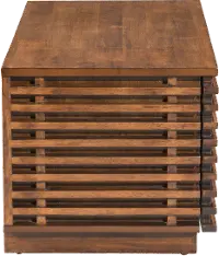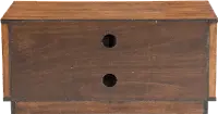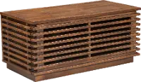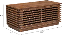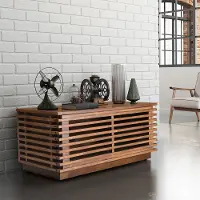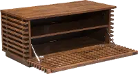 Visually appealing narrow strips of solid Fir wood surround each side and display a modern open look. The front opening door reveals an adjustable shelf to store all of your media and consoles. Two cable outlet openings help keep wires neatly tucked away.