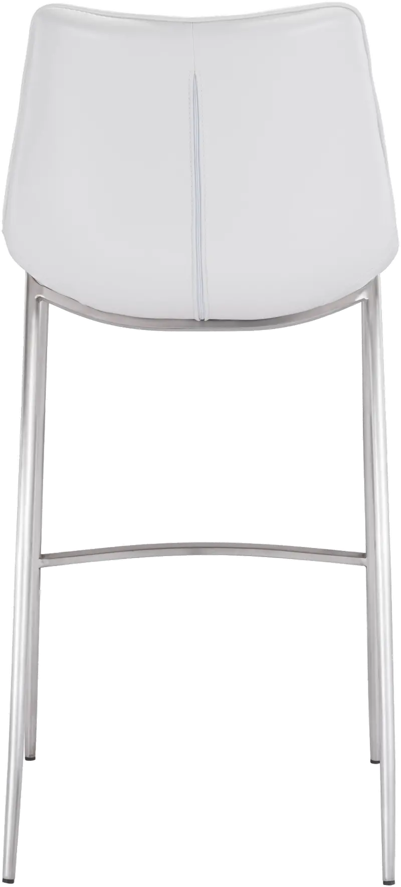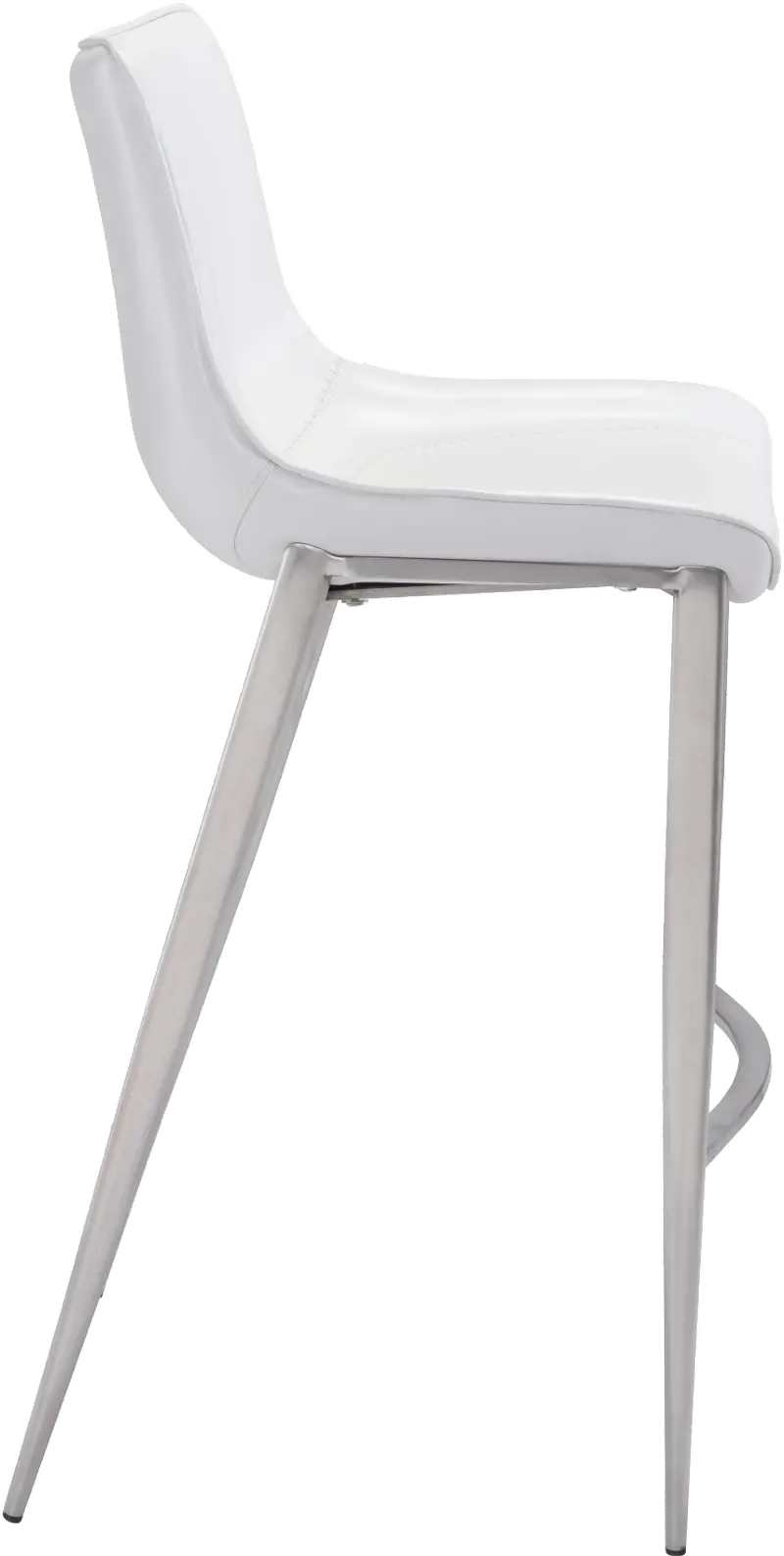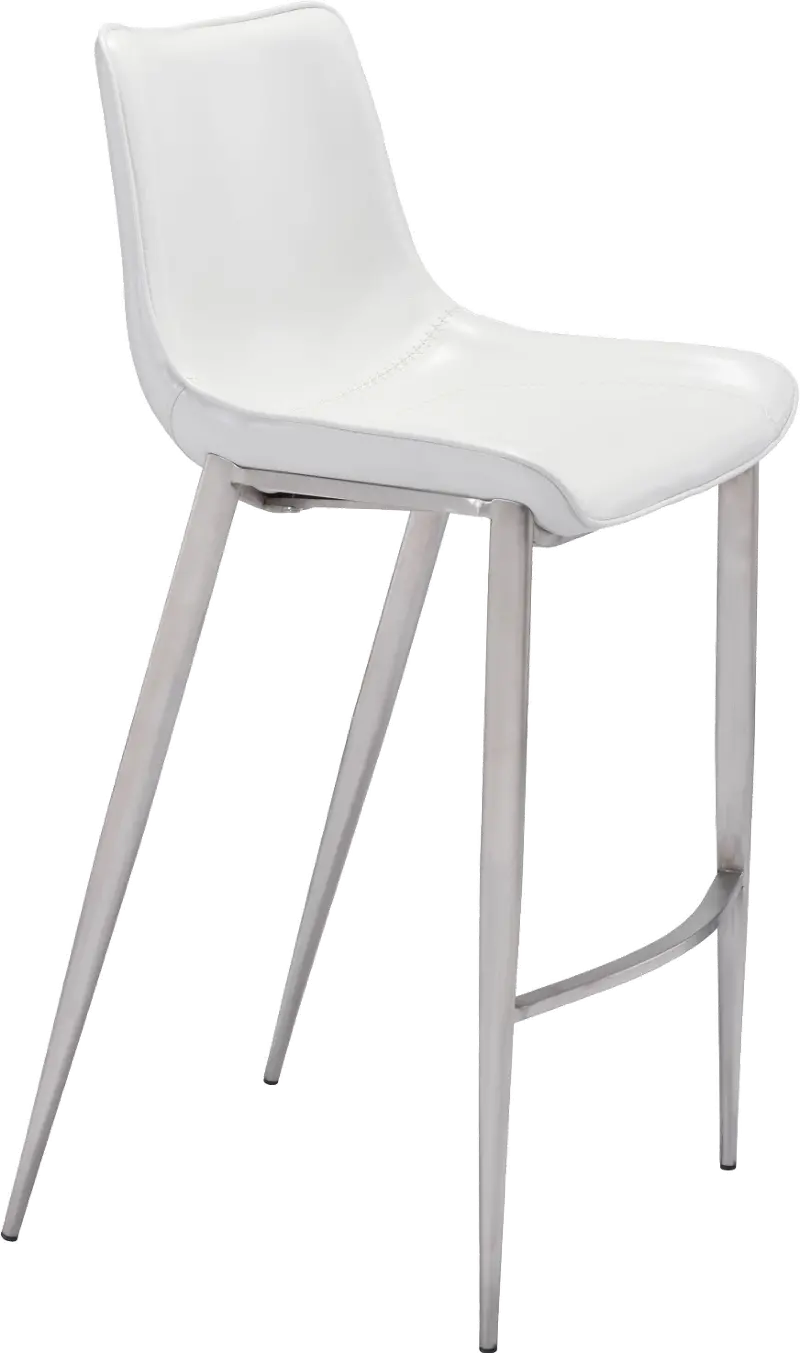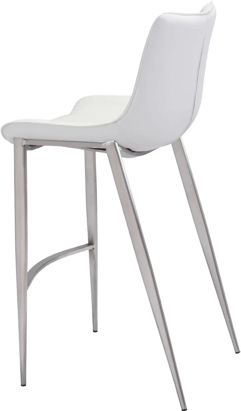 Its slim profile pulls up perfectly to the bar and the super comfortable curved seat is covered in white faux leather with dramatic stitching. Brushed stainless steel legs are complete with protective plastic feet to keep your floors scratch-free.