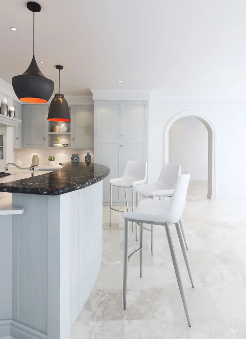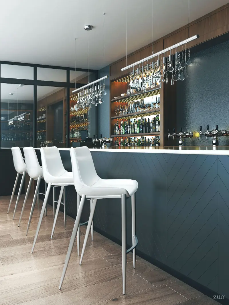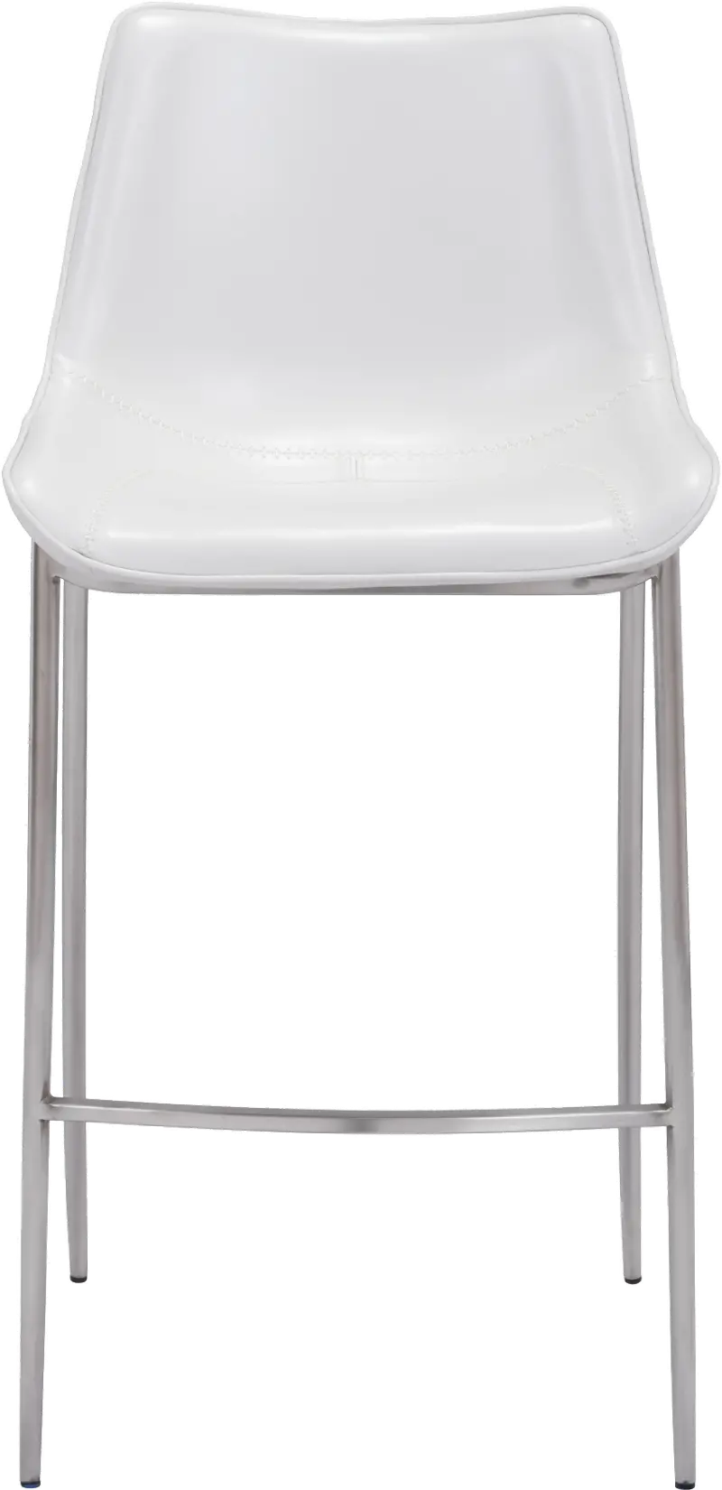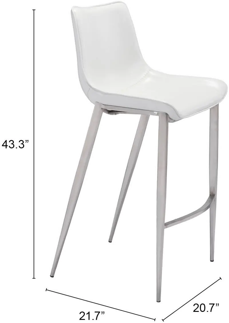 Its slim profile pulls up perfectly to the bar and the super comfortable curved seat is covered in white faux leather with dramatic stitching. Brushed stainless steel legs are complete with protective plastic feet to keep your floors scratch-free.