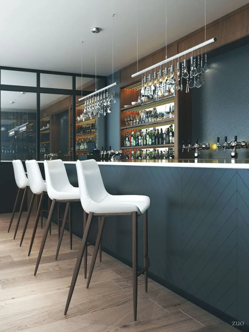 Its slim profile pulls up perfectly to the bar and the super comfortable curved seat is covered in white faux leather with dramatic stitching. Brushed stainless steel legs are complete with protective plastic feet to keep your floors scratch-free.