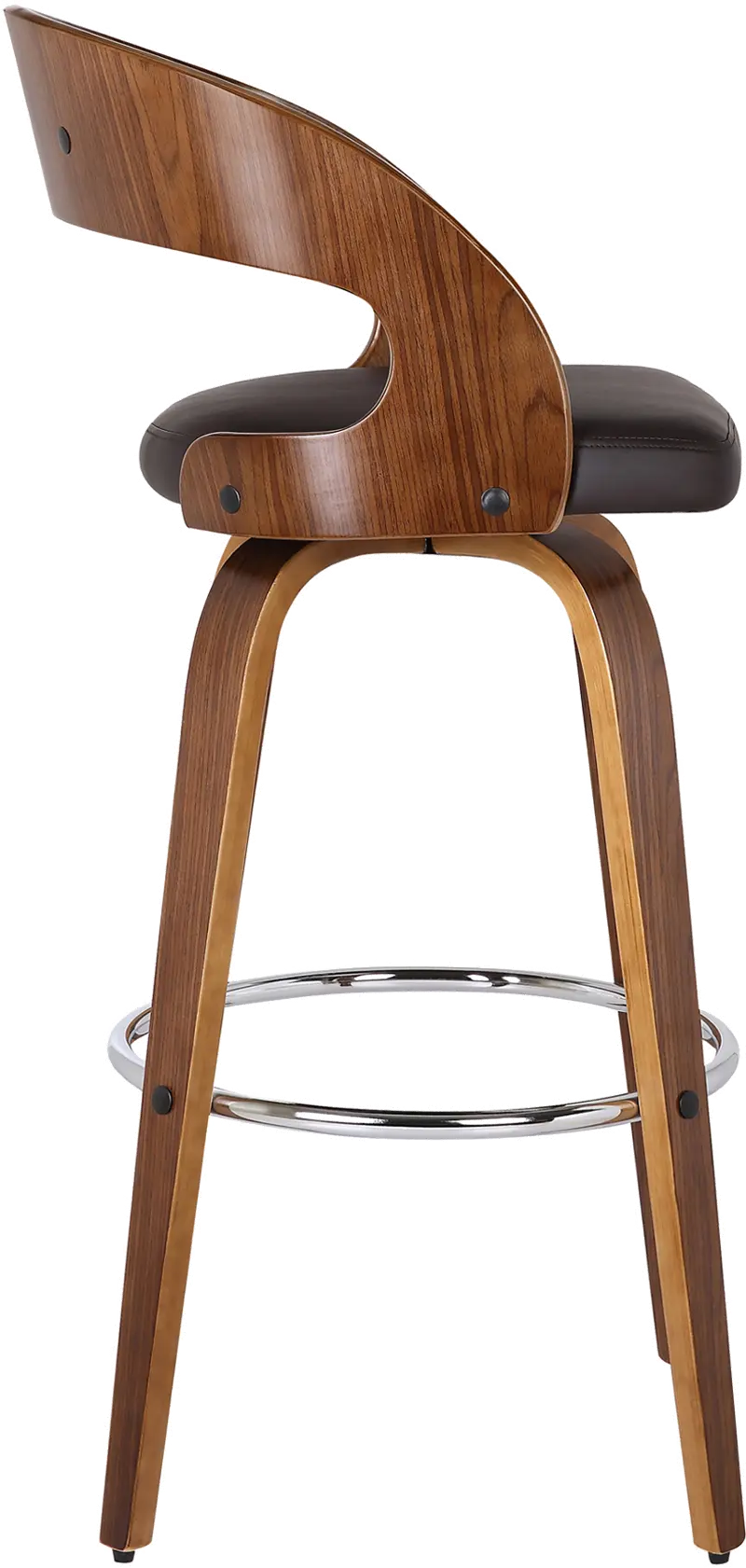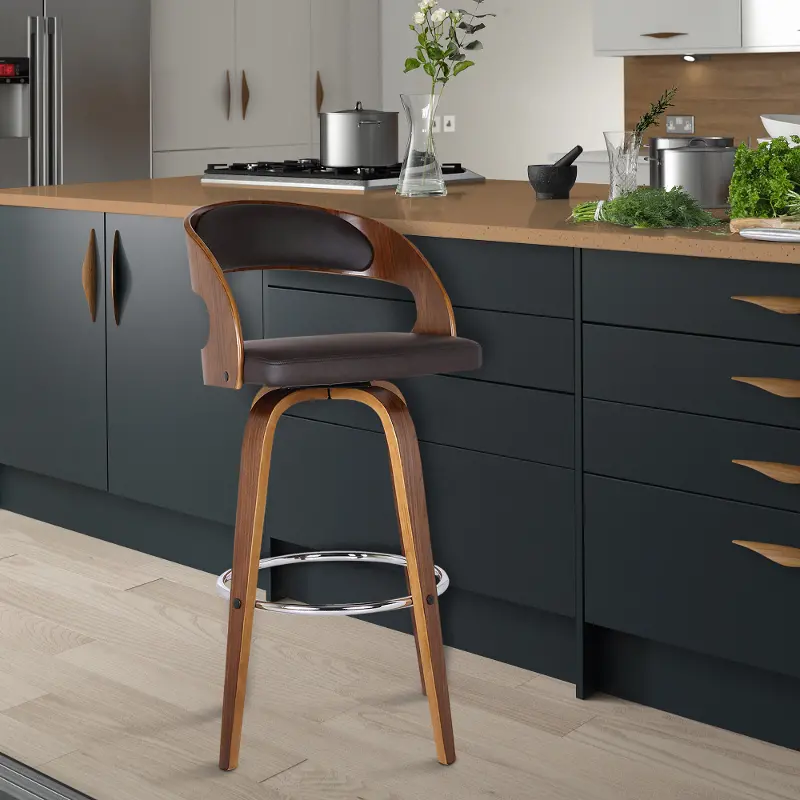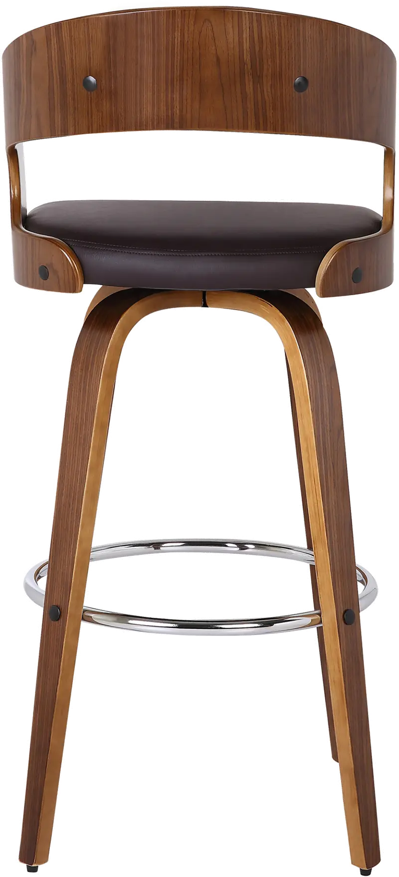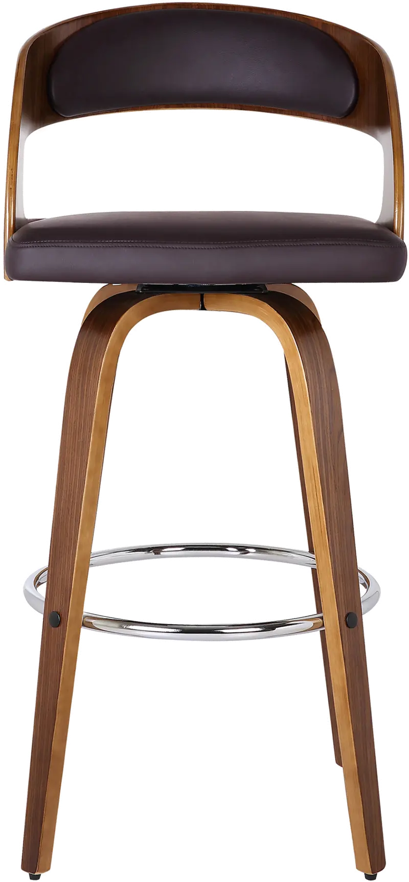 It is elegantly designed with a sturdy 360 degree footrest in a walnut wood finish and upholstered with brown faux leather and padded back for comfort. This piece provides both style and function with the eye-catching contoured wood back that can easily be integrated into your home's existing decor.