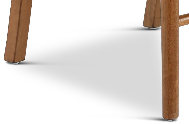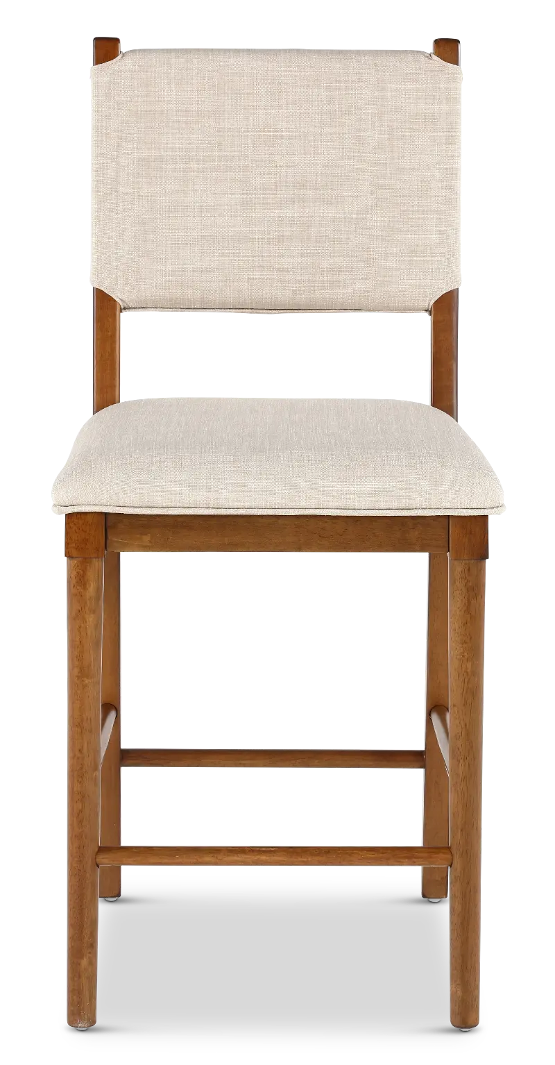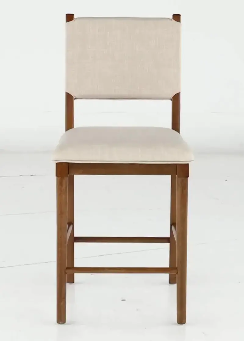 This 24" counter stool features a versatile silhouette with mid-century inspiration. Solidly crafted, it features a pecan brown finish that highlights the natural grain and knots of the wood, while a linen-hued padded seat and backrest add comfort and character.