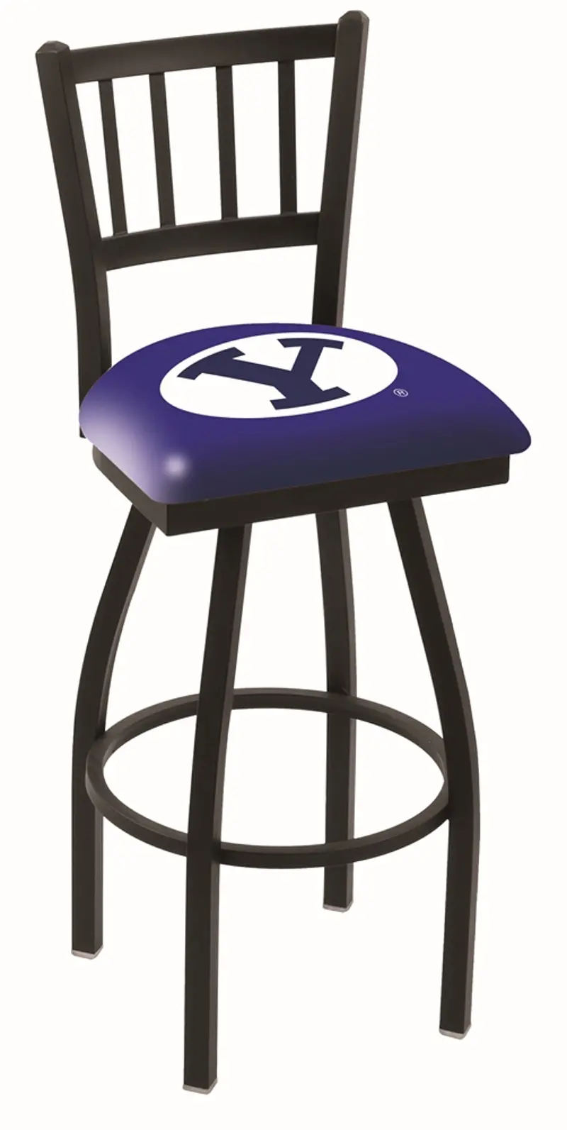 Put your favorite team on display with this contemporary Brigham Young University stool. It carries a defined jailhouse-style-back that doesn't just add comfort, but sophistication. A detailed screen print process is used that applies specially formulated epoxy-vinyl ink in numerous stages to produce a sharp, crisp, clear image of the BYU Cougars logo. You can't find a higher quality logo stool on the market. The plating grade steel used to build the frame is commercial quality, so it will withstand the abuse of the rowdiest of friends for years to come. The structure is a powder-coated black wrinkle to ensure a rich, sleek, long-lasting finish. Construction of this framework is built tough, utilizing solid welds.