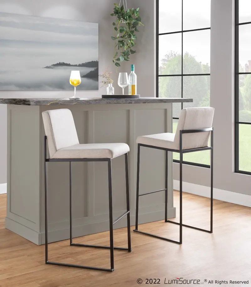 Modern elegance at its finest, the Fuji High Back Bar Stool by LumiSource features an extra-wide (and extra comfortable) upholstered seat, a high padded backrest, and a stylish metal frame.