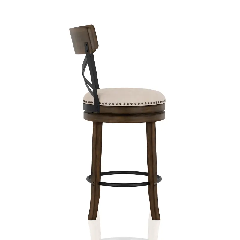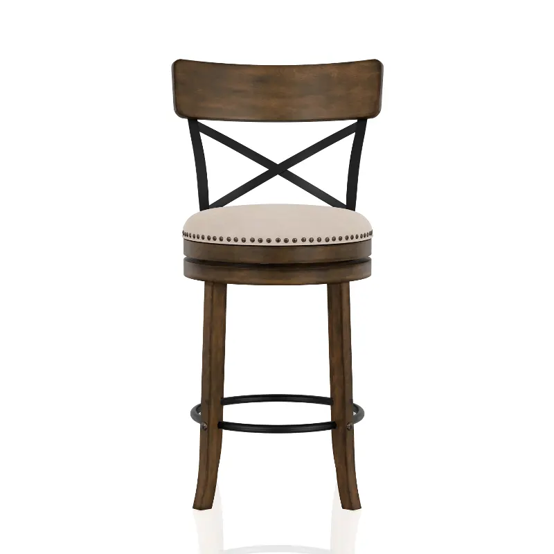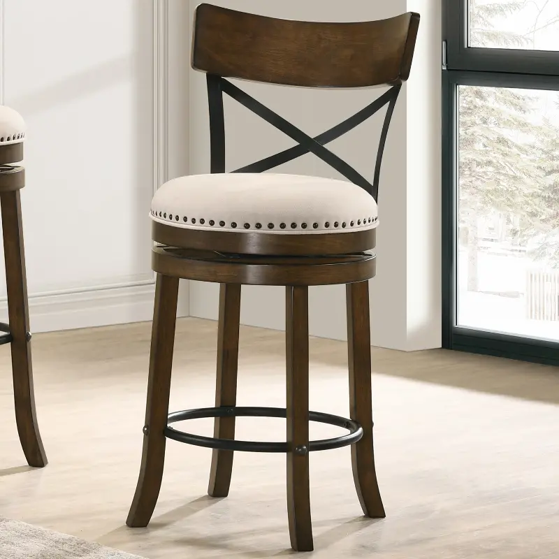 This set of two 24" counter-height stools offers a charming, round swivel seat with a plush cushion and fabric upholstery enhanced with nailhead trim for a classic finishing touch. The backrest features a curved support panel and a metal cross brace for added support. Tapered solid wood legs feature a metal footrest for optimal comfort.