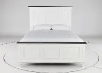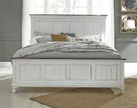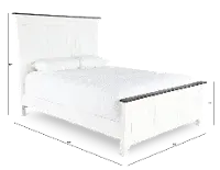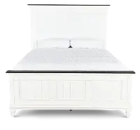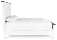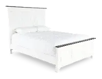 This king size bed's wire-brushed white finish is artfully enhanced with a contrasting charcoal gray plank top along the footboard and headboard. Eye-catching accents like bead molding and plank detailing lend to its enduring design.
