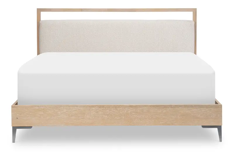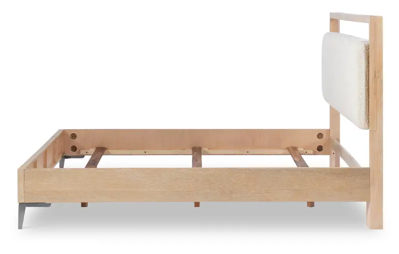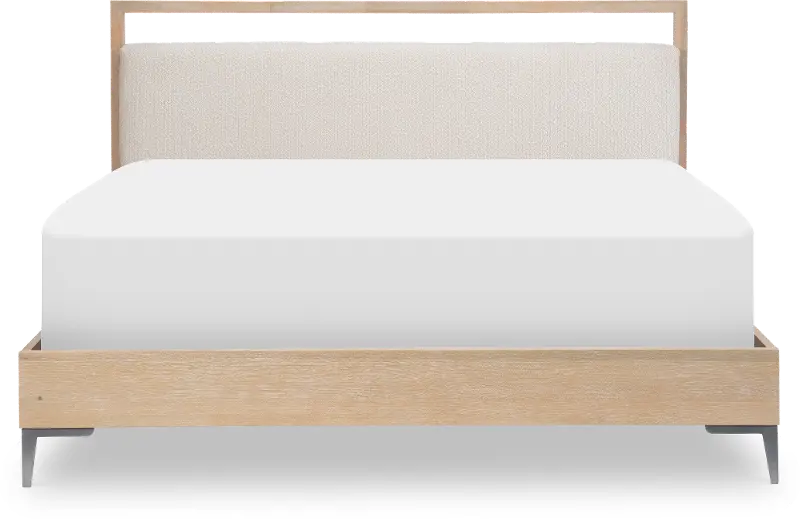 This queen-size bed is sturdily crafted from quartered oak veneers and hardwood and features a natural blonde finish paired with linen-colored upholstery on the headboard. Touch-lighting on the headboard creates an inviting ambiance. The Biscayne collection's artful blending of clean lines, materials, and finishes creates a serene and stylish look that will effortlessly elevate your personal retreat.