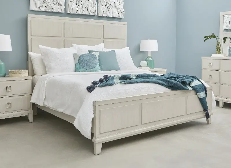 This queen size bed features a translucent white finish that beautifully highlights the wood's natural grain. The wood panel overlay design on the headboard and footboard enhance the bed's chic, refined appeal.