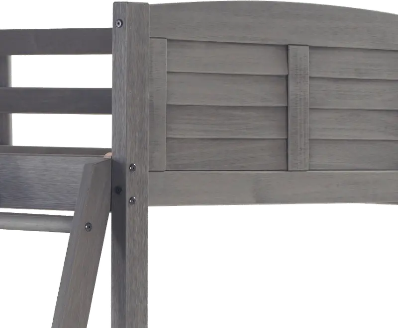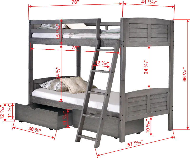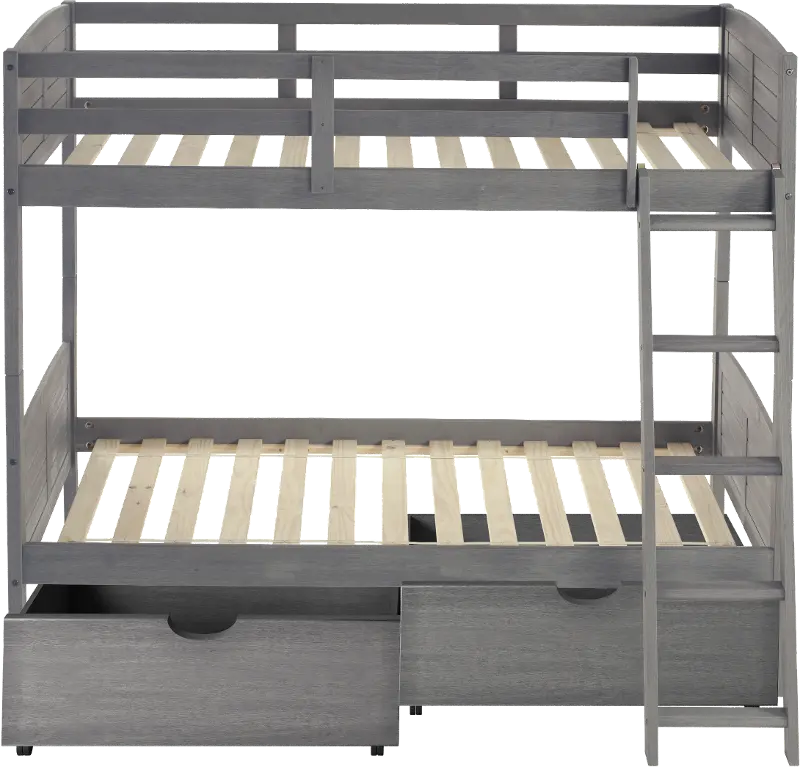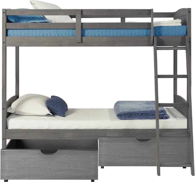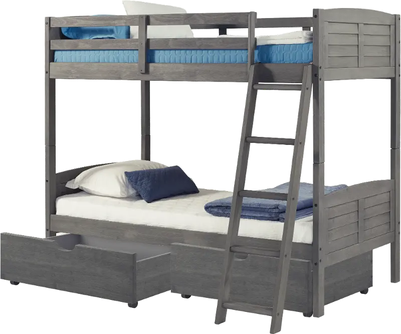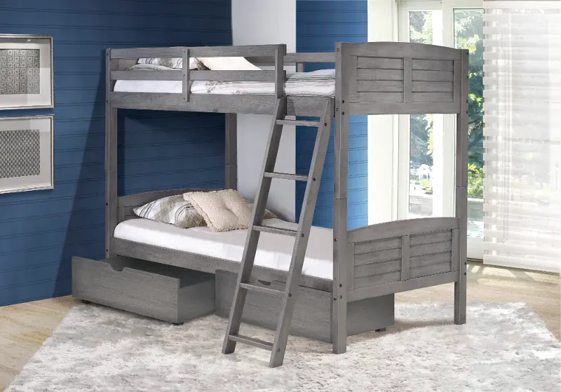 The classic, charming style of this twin-over-twin bunk bed with 2 storage drawers at RC Willey are on full display with its rustic gray finish, louver detailing, and versatile appeal.