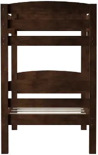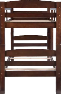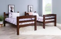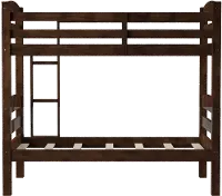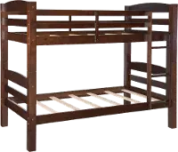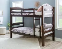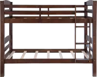The bunk bed is made of pine wood and offers extra room for guests or siblings, featuring a twin bed over a twin bed. The headboard and footboard have a curved slat detail with sturdy square posts. The ladder is built-in and the heavy, duty slats will support a mattress without needing a bunkie board. Beds can be detached to convert into separate twin beds for versatility.