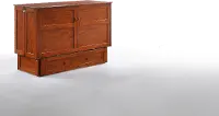 It takes up just 10 square feet of floor space when all closed. It offers solid hardwood construction and a classic silhouette in a warm and inviting cherry finish that will blend in with various decorating tastes. This highly functional Murphy bed features a large rolling storage drawer, a higher sleep platform, and a built-in dual power/USB module.