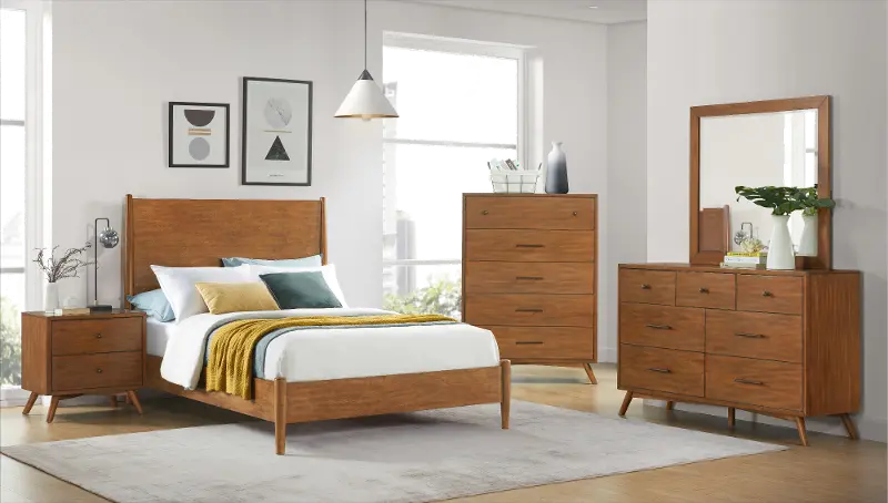 This full-size bed is sturdily crafted from poplar solids and birch veneers and features a warm and versatile cinnamon-brown finish. Its chic yet simple platform design will effortlessly enhance any bedroom space!