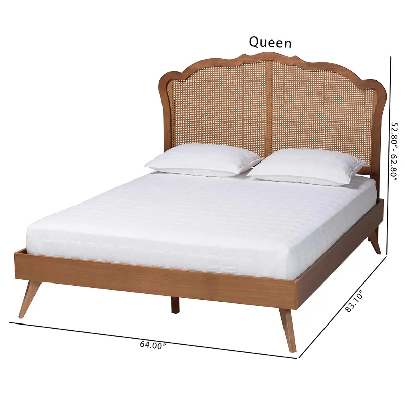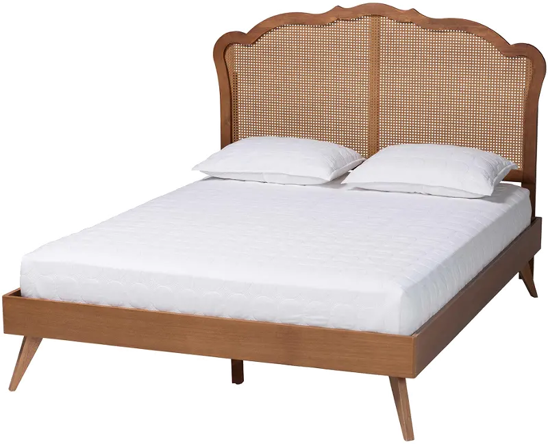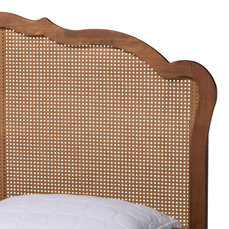 The sturdy frame supports a broad headboard embellished with a woven rattan design. A curved silhouette lends a unique texture and shape to enhance the design of the whole piece. Wood slats provide mattress support, eliminating the need for a box spring.