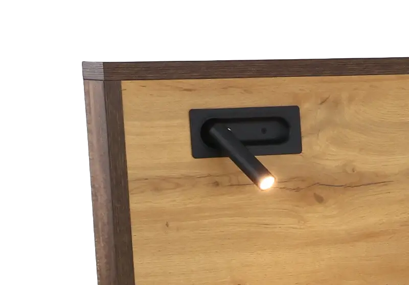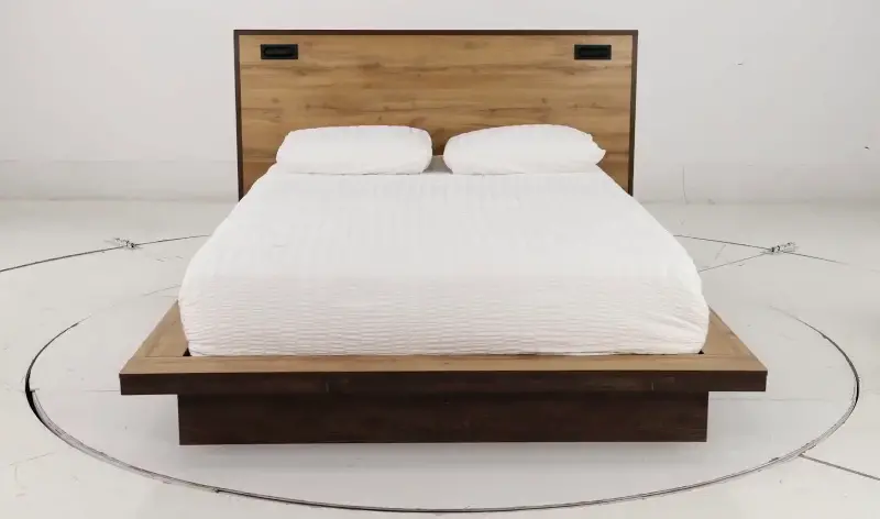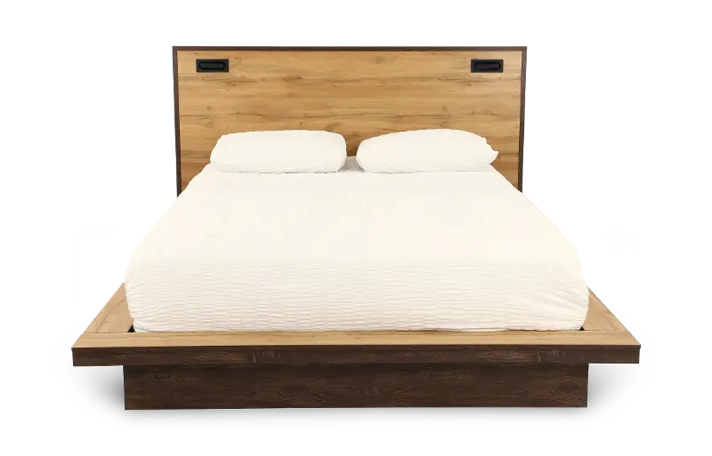 This queen-size platform bed is solidly crafted with a clean-lined silhouette, with two-tone antique natural and brown hues adding handsome contrast. The headboard features two recessed articulating LED lights, while the platform offers a perimeter ledge that enhances its eye-catching appeal.