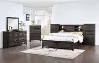 Includes bookcase headboard, storage footboard, right storage pier, left storage pier, and rails.