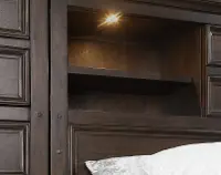 - Bookcase headboard features convenient lighting, storage and display surfaces, and a sliding panel