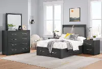 Solidly built, this full-size storage bed features clean lines and curved edges finished in a rich and vibrant black color. The cozy upholstered headboard with a swiveling light fixture sets a perfect backdrop for bedtime reading, while handy drawers located in the side rails and footboard make it easy to keep your space organized and tidy.