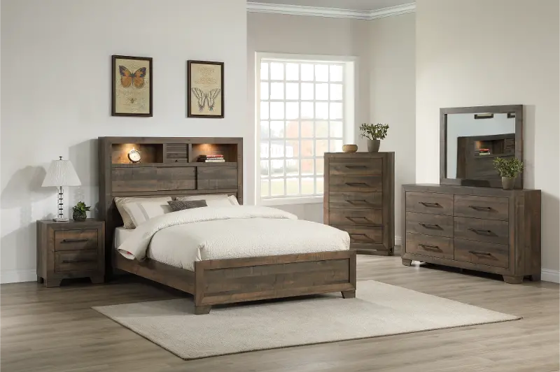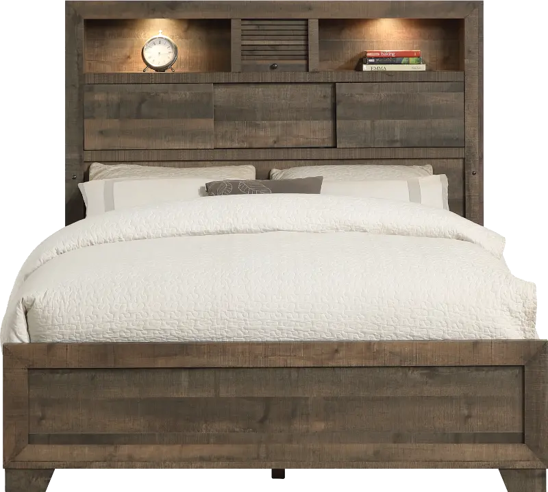 Sturdily crafted, the full-size bed features a rustic brown finish with real wood texture, bringing the beauty of the outdoors into your bedroom space. The bookcase headboard offers handy lights and convenient storage to keep bedtime necessities within easy reach.