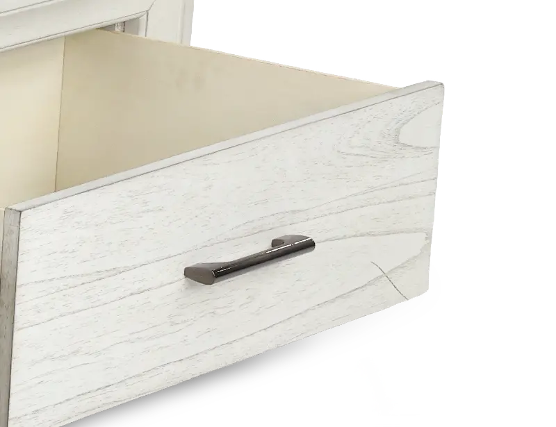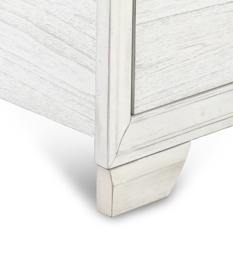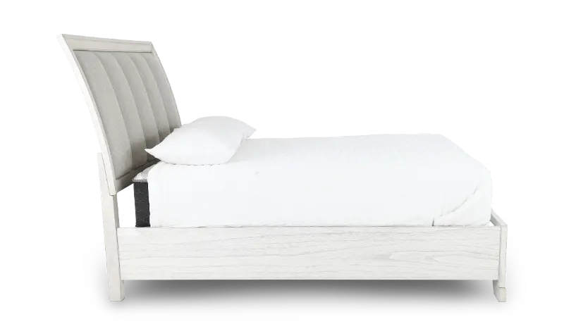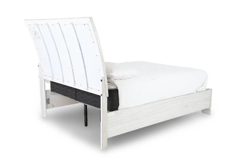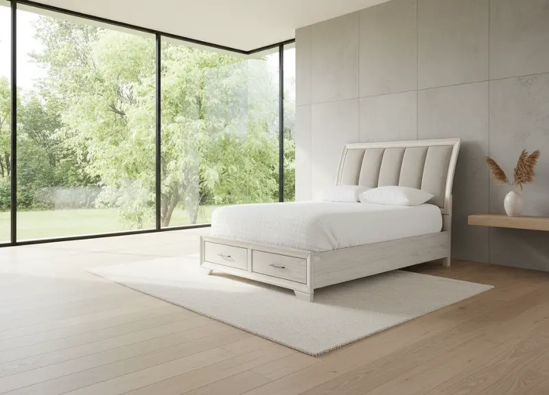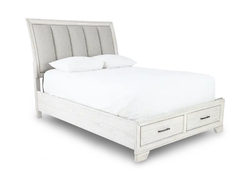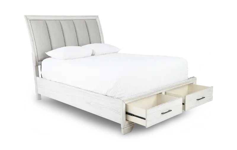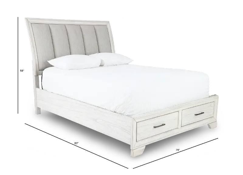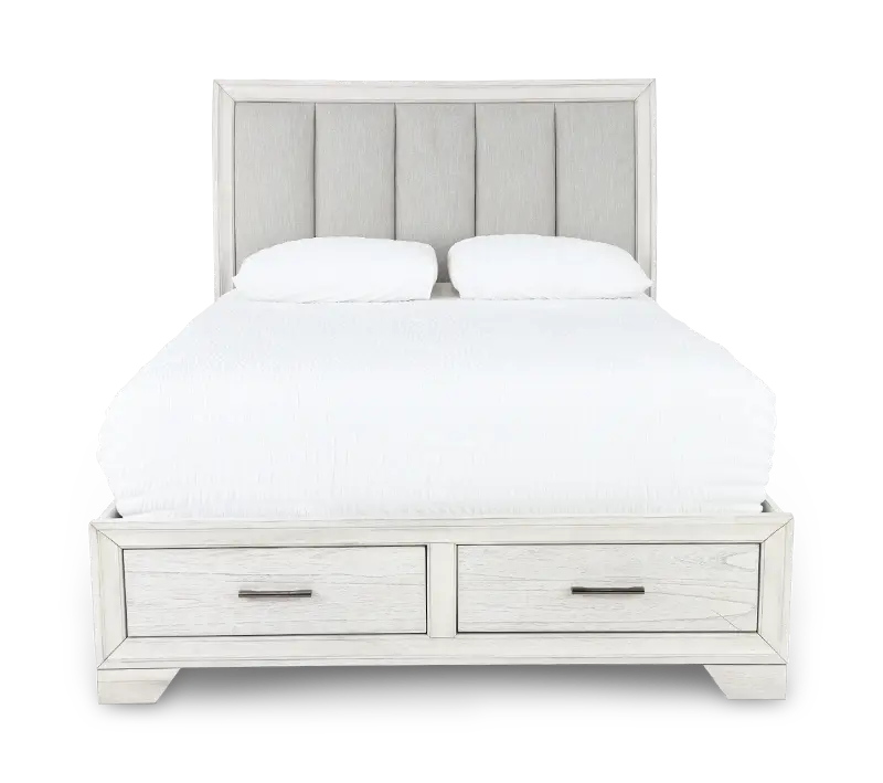 This king-size storage bed is solidly crafted with simple detailing and finished in a timeless white hue. The headboard offers eye-catching upholstered vertical panels, while the footboard provides handy storage with its 2 drawers.