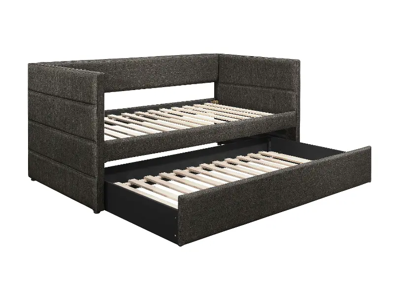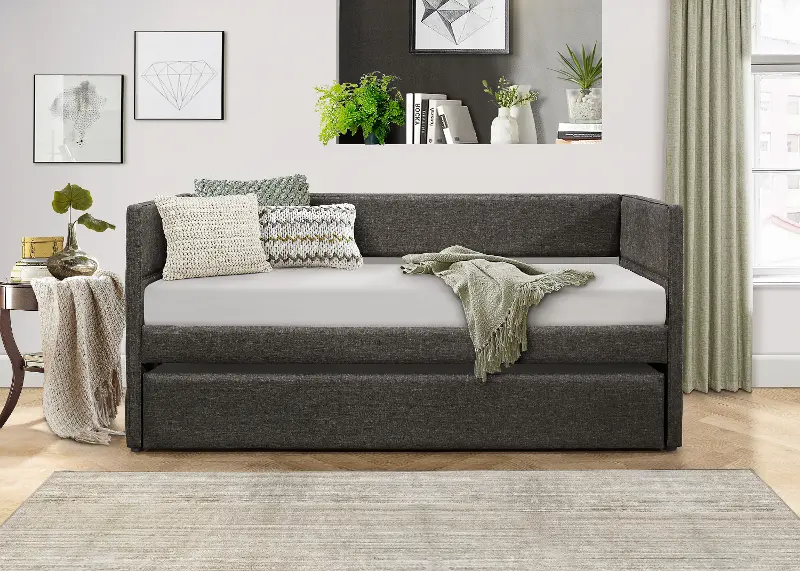 Its clean lines and dark gray upholstery lends to its stylistic versatility. Plus, a twin-size trundle pulls out to accommodate additional sleeping space needs.