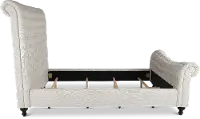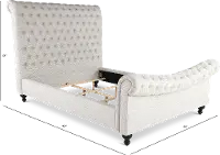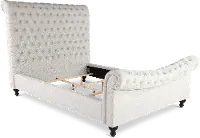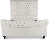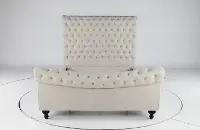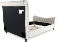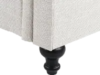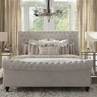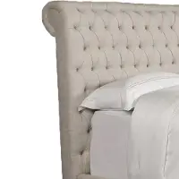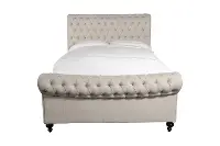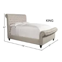 This king size upholstered bed features a Chesterfield-inspired sleigh design that is beautifully covered in a neutral and inviting sand colored fabric. Eye-catching tufting and scalloped, turned wood feet finished in a rich dark brown adds elegance and traditional charm. Its plush layers of padding and soft upholstery ensure you are comfortably supported as you lounge in bed enjoying a favorite book or movie.
