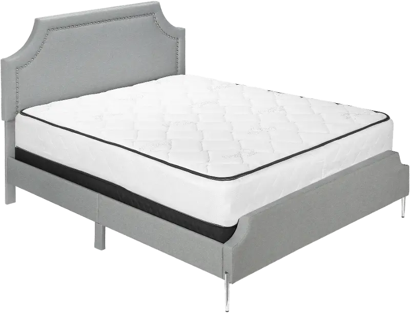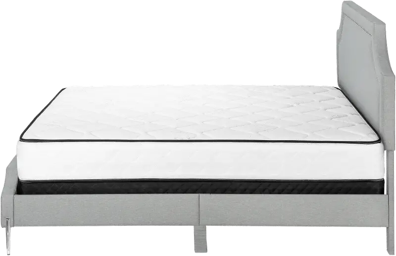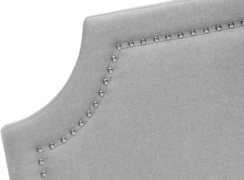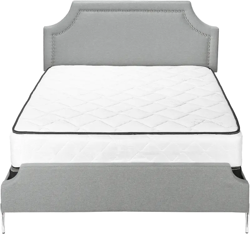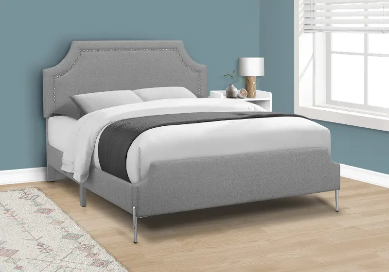 - Queen size contemporary platform bed frame upholstered in an elegant Gray linen-look fabric over foam padding on all sides, with chrome nail-head trim on the arched cut-out headboard for a subtle glamourous touch