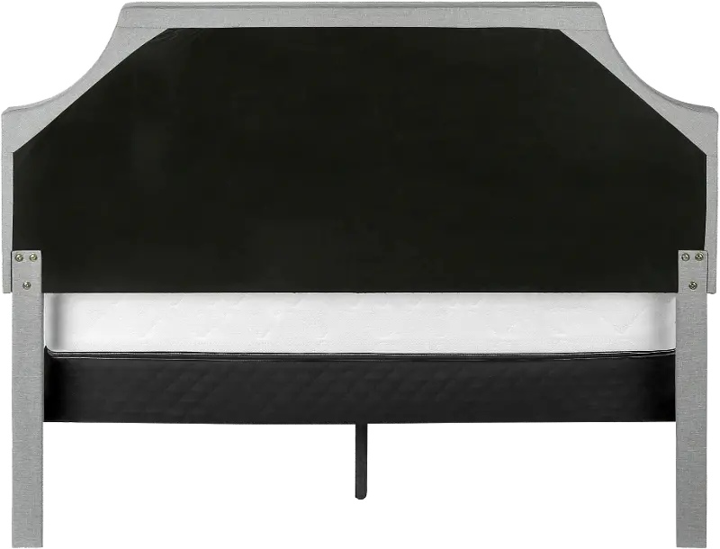 This queen-size upholstered bed frame is wrapped in a neutral gray linen-look fabric on all sides over foam-padded cushioning. Chrome nail-head trim stylishly outlines the arch cut-out on the headboard for that subtle hit of glam. The support legs in the back and middle are covered with a removable gray-linen fabric to quietly blend with the rest of the frame, and the front chrome metal feet bring sleek glamour to the whole bed.