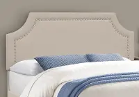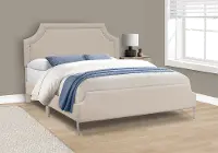 - Queen size contemporary platform bed frame upholstered in an elegant Beige linen-look fabric over foam padding on all sides, with chrome nail-head trim on the arched cut-out headboard for a subtle glamourous touch