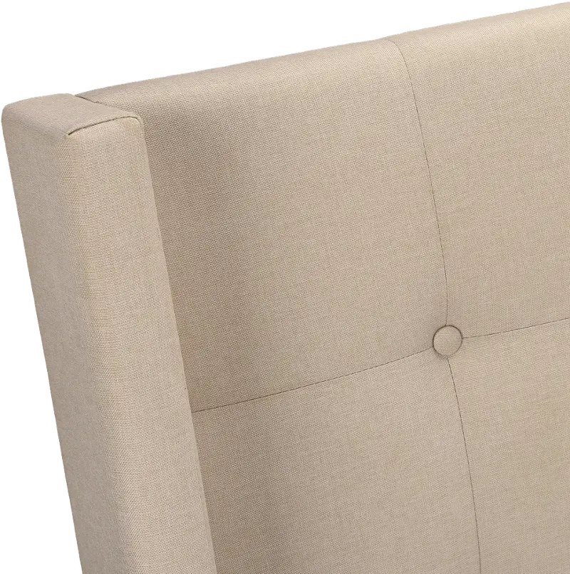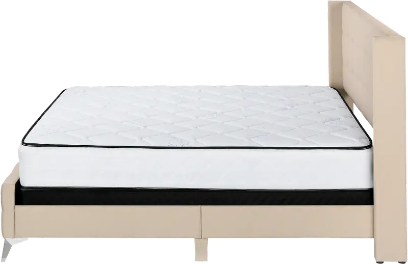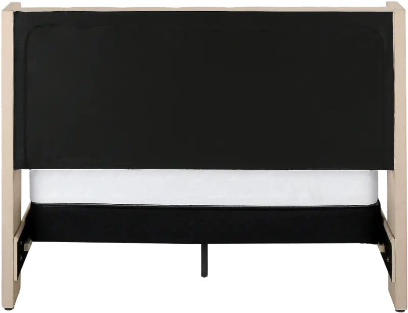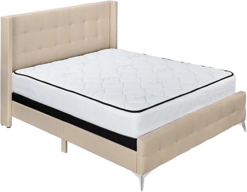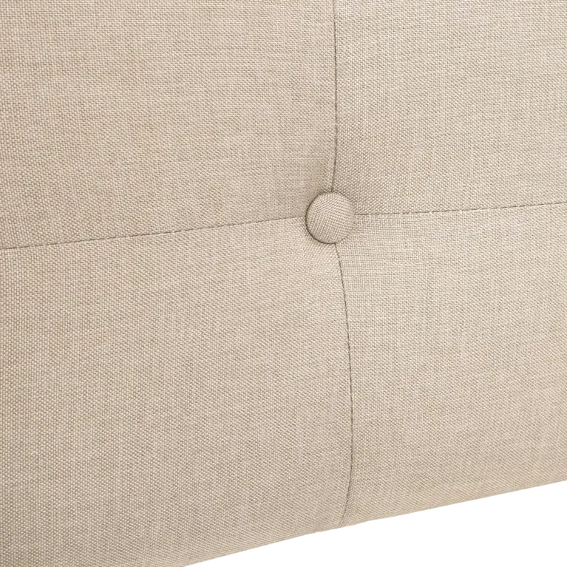 - Queen size contemporary platform bed, upholstered in a chic Beige linen-look fabric over foam padding on all sides, with luxurious button tufting on the wingback headboard and curved footboard