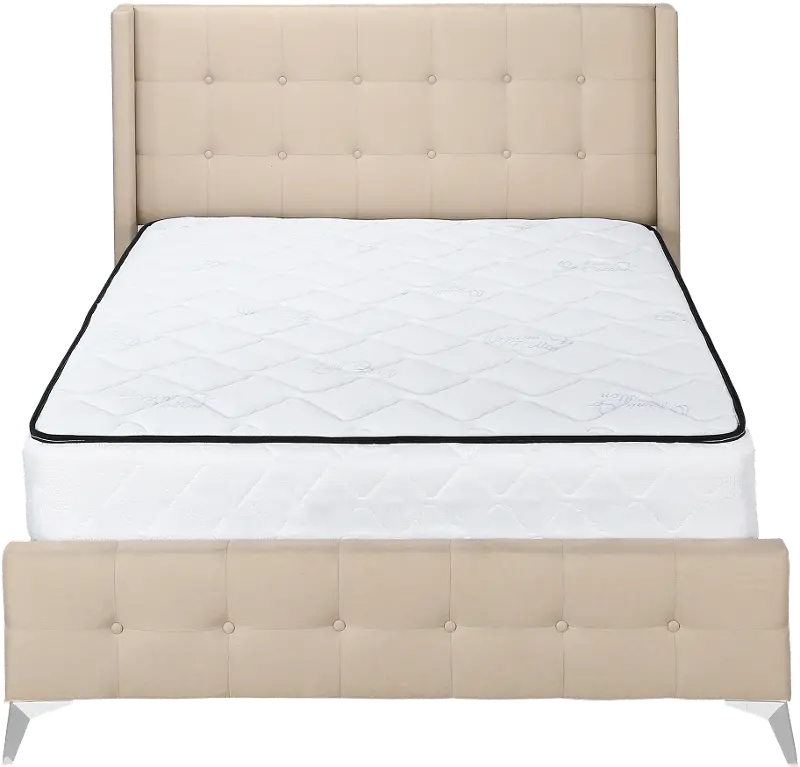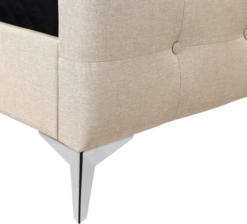 This queen-sized bed frame is covered in a neutral beige linen-look fabric over foam cushioning on all sides, with elegant button tufting on both the curved headboard and footboard for a luxurious appeal. The support legs are covered with the same beige linen-inspired material for an attractive finish, and the curved chrome metal feet at the footboard give the whole bed that hint of modernity and glam.