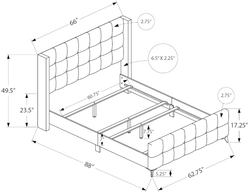 - This bed frame requires a standard queen size box spring and mattress (not included)
