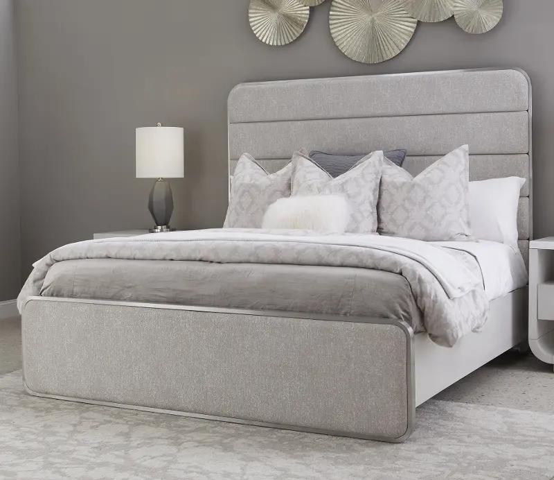 The headboard and footboard of this queen-size bed are upholstered in a soft gray fabric paired with sleek metal trim that draws attention to its streamlined silhouette. Horizontal tucked pleat tufting enhances its visual interest and will set a chic backdrop for your bedroom space.