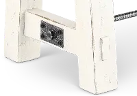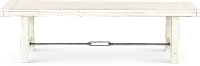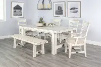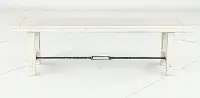 This dining bench is sturdily crafted from distressed mahogany solids and features a fresh and inviting white sand finish. A turnbuckle accent on the bench base adds sturdiness and flow.